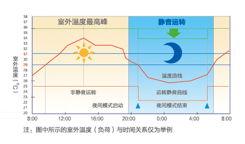 啟動(dòng)靜音功能后,當(dāng)室外溫度低于29℃時(shí)主機(jī)自動(dòng)調(diào)低風(fēng)機(jī)轉(zhuǎn)速,降低噪音;當(dāng)室外溫度高于31℃時(shí)自動(dòng)恢復(fù)正常運(yùn)行。通過室外溫度傳感器檢測(cè)室外環(huán)溫機(jī)型靜音運(yùn)轉(zhuǎn)控制,最大可降低16d(B)A噪音。