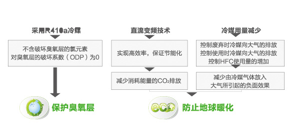 采用R410a環(huán)保冷媒,該冷媒傳熱性能好、壓力損失小、滑移溫度非常小,對(duì)臭氧層的破壞系數(shù)(ODP)為0。